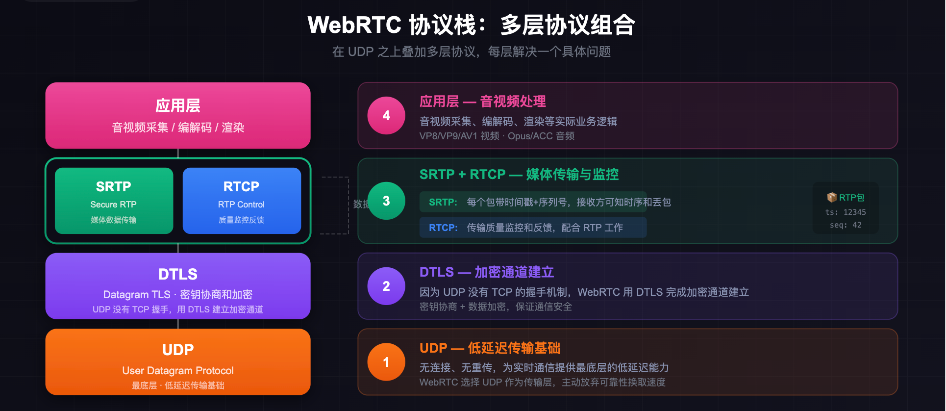 最底层是 UDP,负责低延迟传输,这是整个 WebRTC 的地基。
