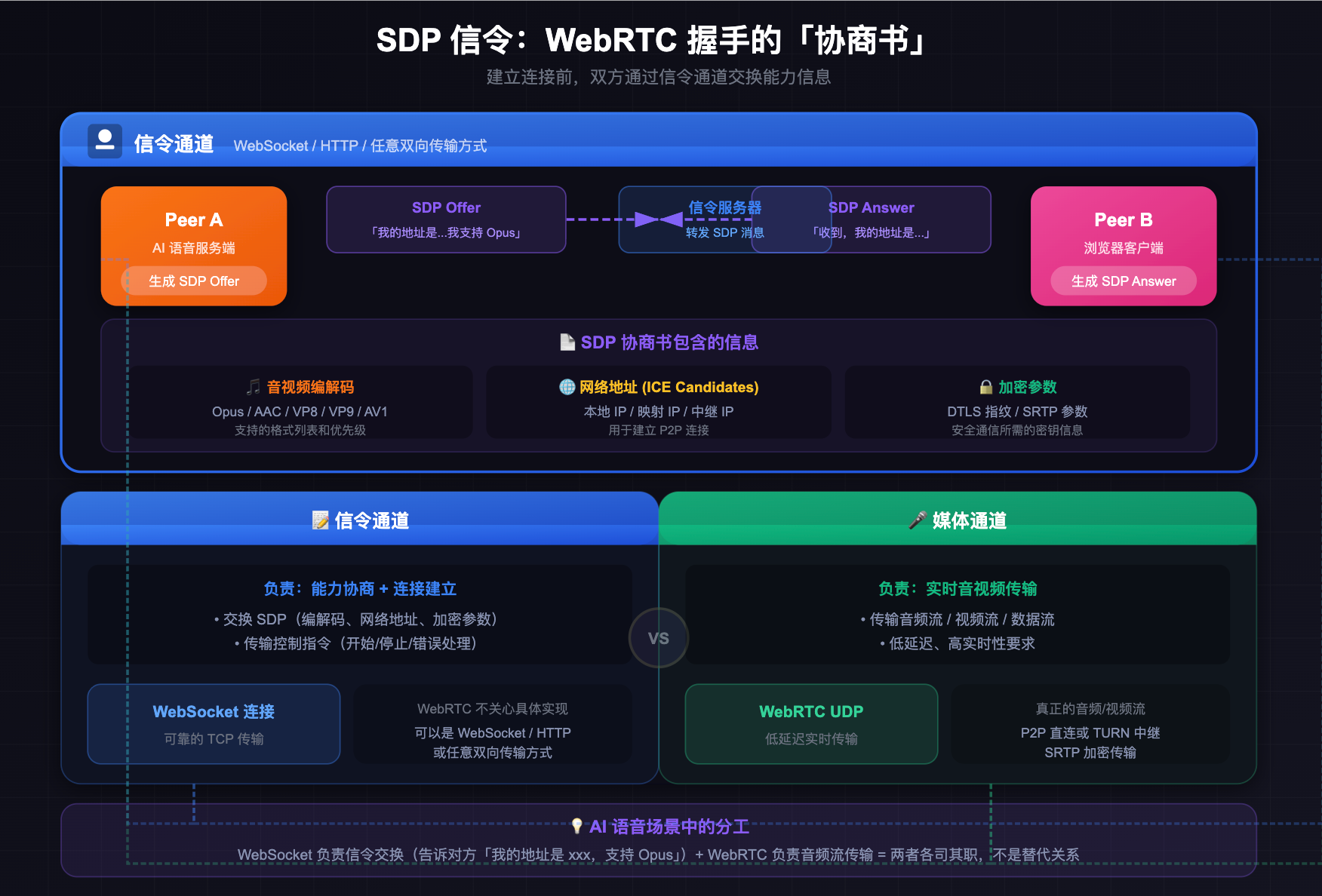 SDP 本身只是一种格式,不规定如何传输。双方需要通过一个「信令通道」来交换 SDP,这个信令通道可以是 WebSocket、HTTP 或者任何能双向传输的方式,WebRTC 不关心。这就是为什么用 WebRTC 做 AI 语音时,还是需要一个 WebSocket 连接:WebSocket 负责信令交换(告诉对方「我的网络地址是 xxx,我支持 Opus 编解码」),真正的音频流走 WebRTC 的 UDP 通道。两者各司其职,不是替代关系。