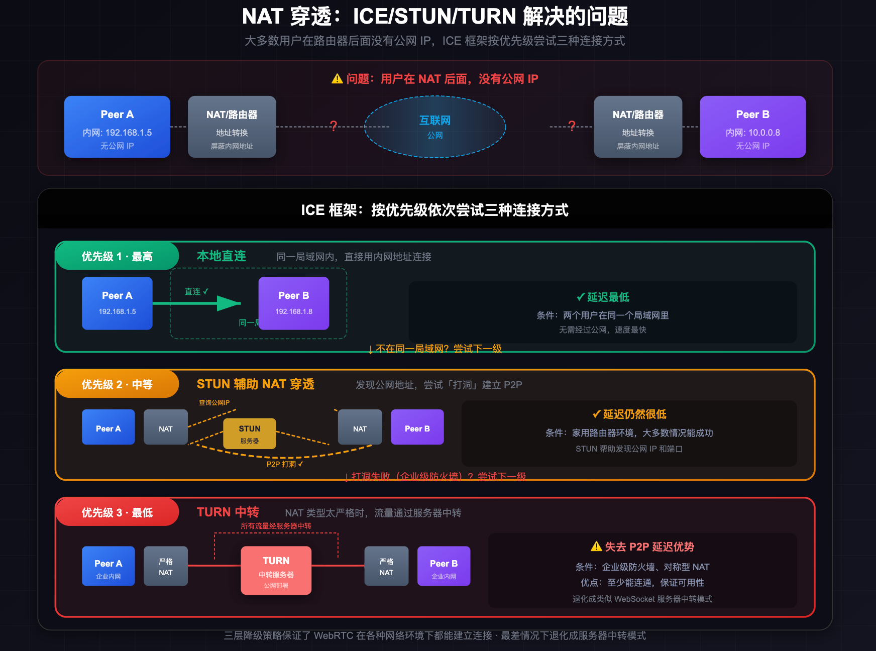 现实中大多数用户都在路由器后面,没有公网 IP,直接用内网地址互相连接是行不通的。WebRTC 用 ICE 框架来解决这个问题,ICE 会按优先级依次尝试三种连接方式: