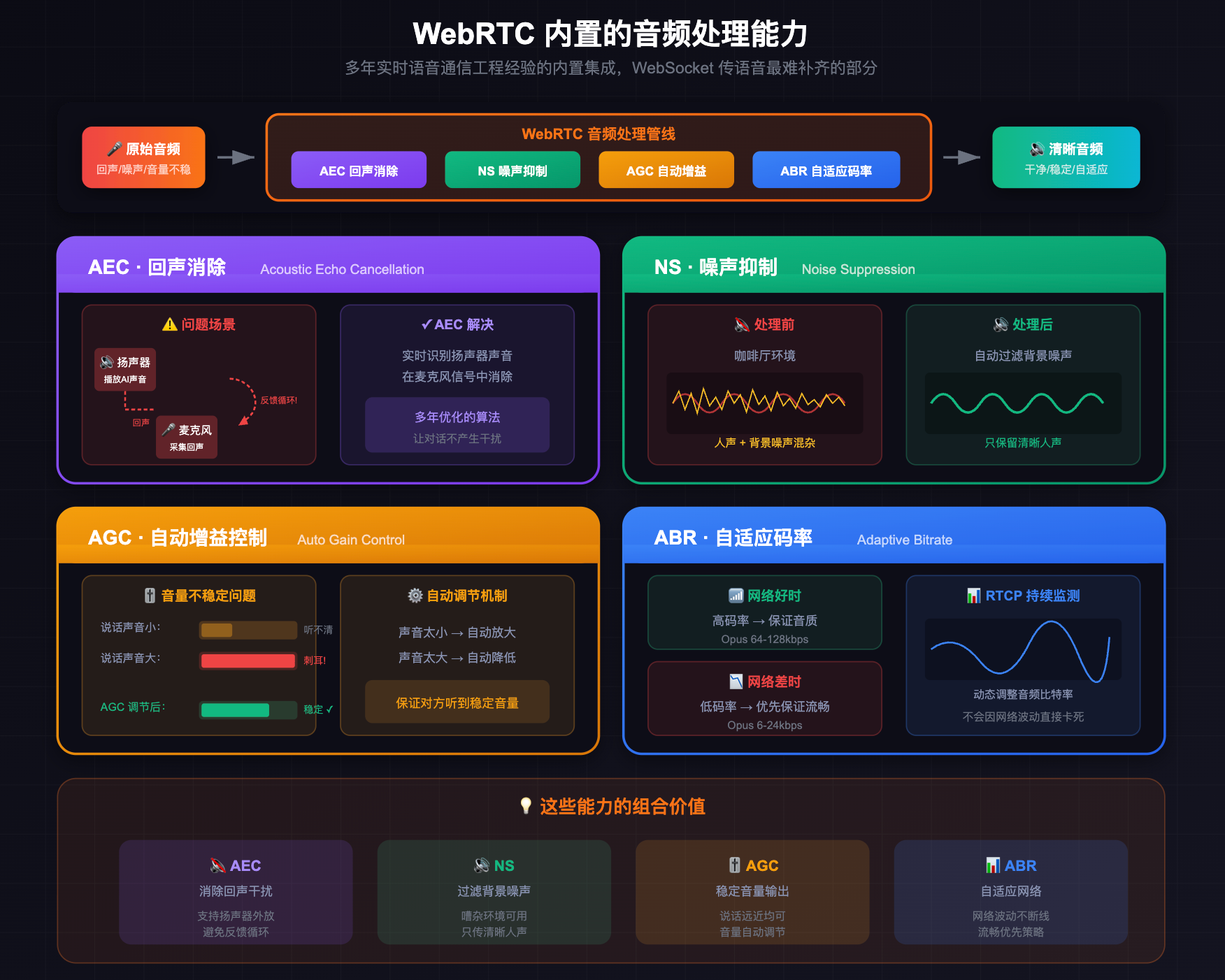 WebRTC 不只是一个传输协议,它把多年来实时语音通信领域积累的工程经验都内置进去了,这是用 WebSocket 传语音最难补齐的部分。